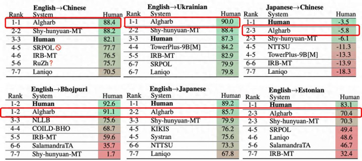 图:Marco-MT-Algharb在WMT2025拿下6项冠军,在英译中等语向表现超过人工翻译