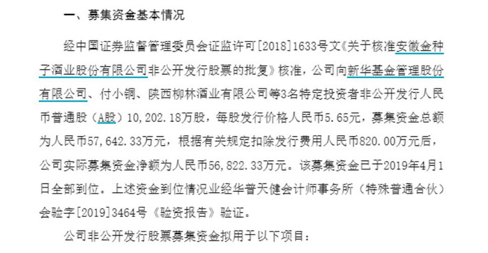 公告显示,公司2019年4月完成非公开发行股票,募集资金总额5.76亿元,扣除发行费用后实际净额5.68亿元,拟投入“优质基酒技术改造及配套工程项目”(以下简称优质基酒项目)和“营销体系建设项目”(以下简称营销体系项目)两大核心项目。