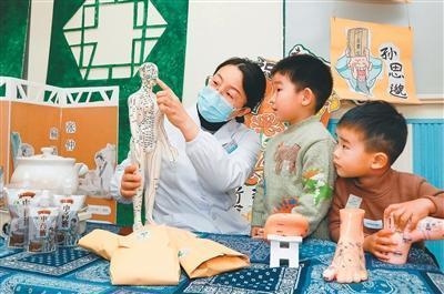 在江苏省海安市一托育中心举办的中医主题游园会上,医务人员正在教小朋友认识人体穴位。 顾彬斌摄(人民图片)