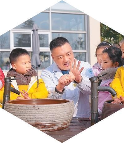 浙江省湖州市安吉县实施“医育结合”托育服务新模式,依托当地优质医疗资源、提供常态化驻园健康照护指导、膳食营养指导等服务。 图为安吉县天子湖第一幼儿园,医护人员引导小朋友正确洗手。 潘学康摄(人民图片)
