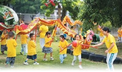 四川省泸州白酒产业园区天骄托育园的老师带领孩子们舞龙。 新华社记者 江宏景摄